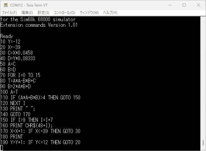 EhBASICは68000用に記述されたBASICで、Easy68Kでアセンブルできます。コンソールの入出力の部分をこのVMEボード用に書き換えたものを作成しました。