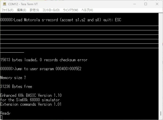 Easy68Kで生成されたSレコードはzBugモニタで読み込むことができました。モニタでEhBASICのコールドスタートアドレスから実行したところ、EhBASICが起動しました。