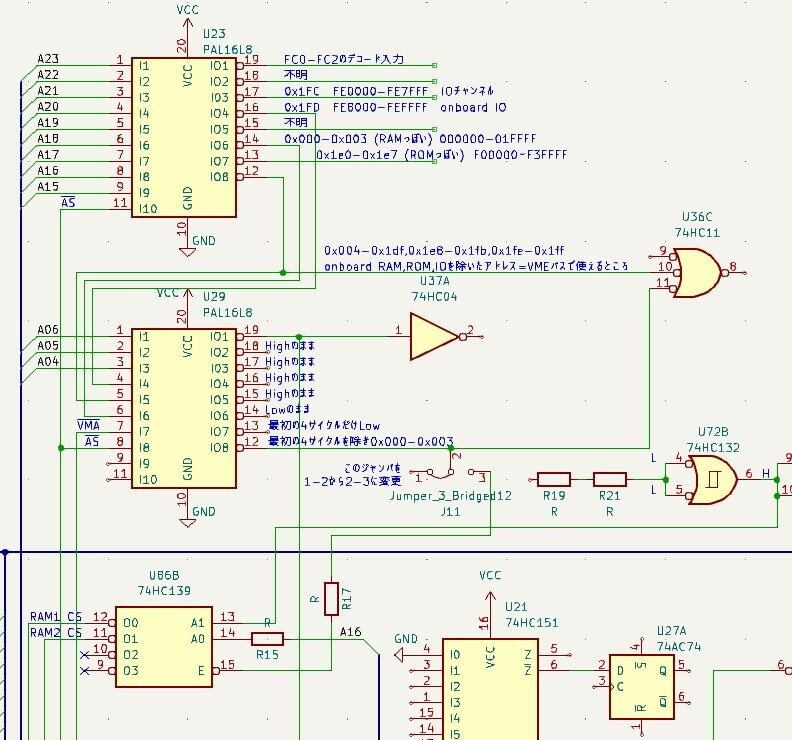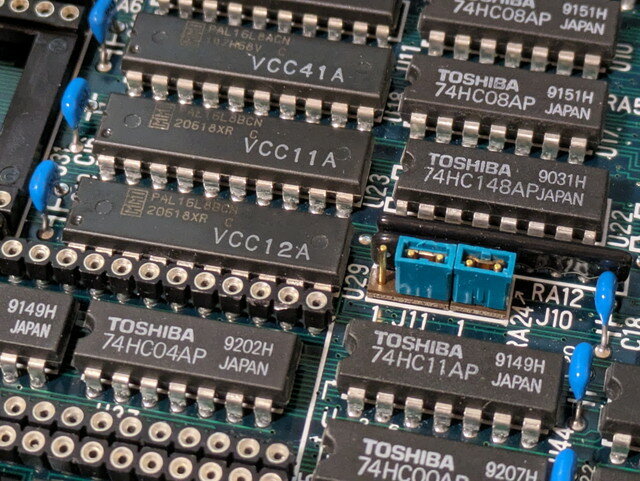 電源を切断してもRAMのCS信号がHIGHのままであることに着目し、バッテリーバックアップされているICを中心に調査しました。その結果U86の74HC139にRAM1、RAM2のCSが接続されていることが確認できました。こうなるとアドレスデコーダのPALの出力がこのU86に接続されているはずなのですが、テスタで確認できません。目視でパターンを追ってみると、途中に抵抗が接続されていることがわかりました。これでテスタで導通が確認できなかったわけです。さらにその先はJ11ジャンパーピンに接続されていましたが、なぜかアドレスデコーダのPALから切り離されていました。