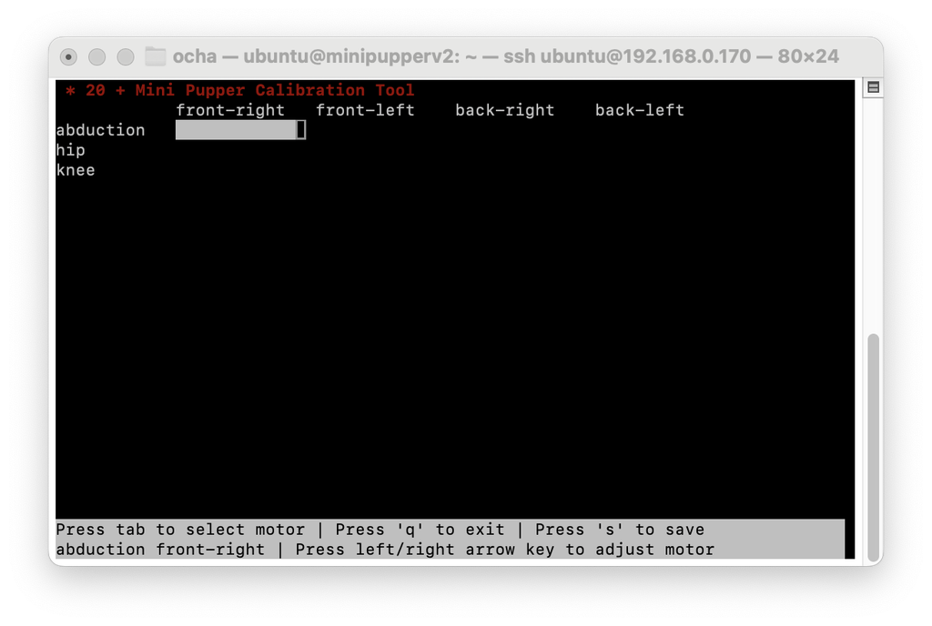 Mini Pupper 2にsshでログインしてcalibrateツールをたちあげます。この画面でサーボモーターを1つずつ動かしながら脚と腰の位置を調整していきます。