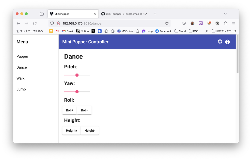 Mini Pupper 2のファームウェアに搭載されているGUIツールを使って動作確認を行います。電源投入時に表示されるIPアドレスにWebブラウザで接続します。プロトコルはhttpでポートは8080です。