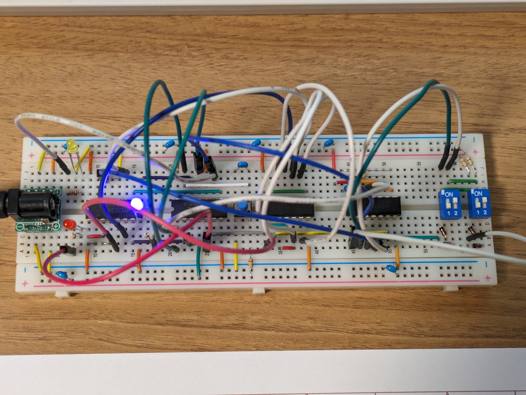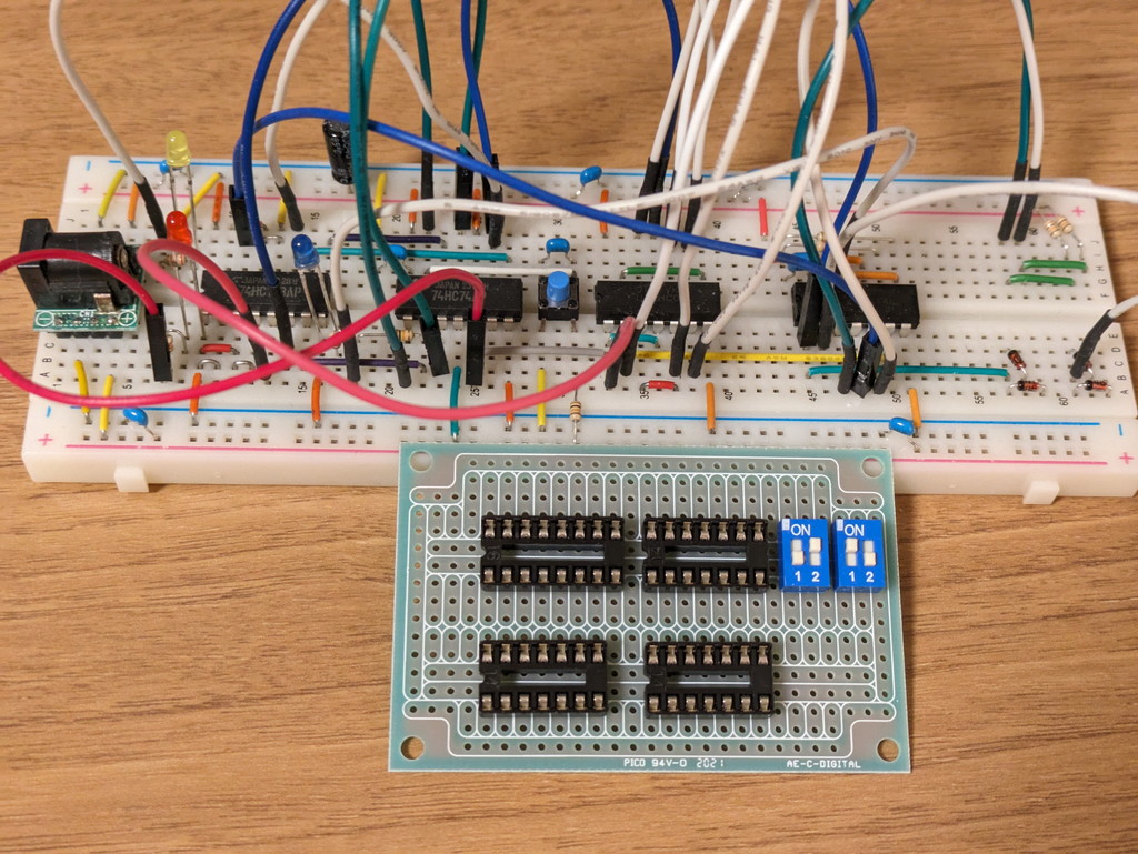 ブレッドボードで実装したものは写真のようになりました。スイッチサイエンスさんで販売されているキットに合わせてLEDの色はClock: Blue, Green: PC, Red: Registerとしました。