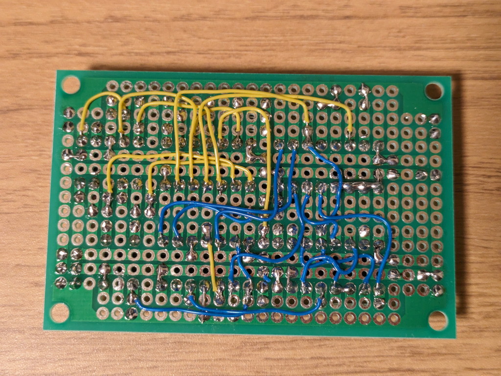実際にユニバーサル基板に実装した1bit CPUです。コンパクトに収まりました。
