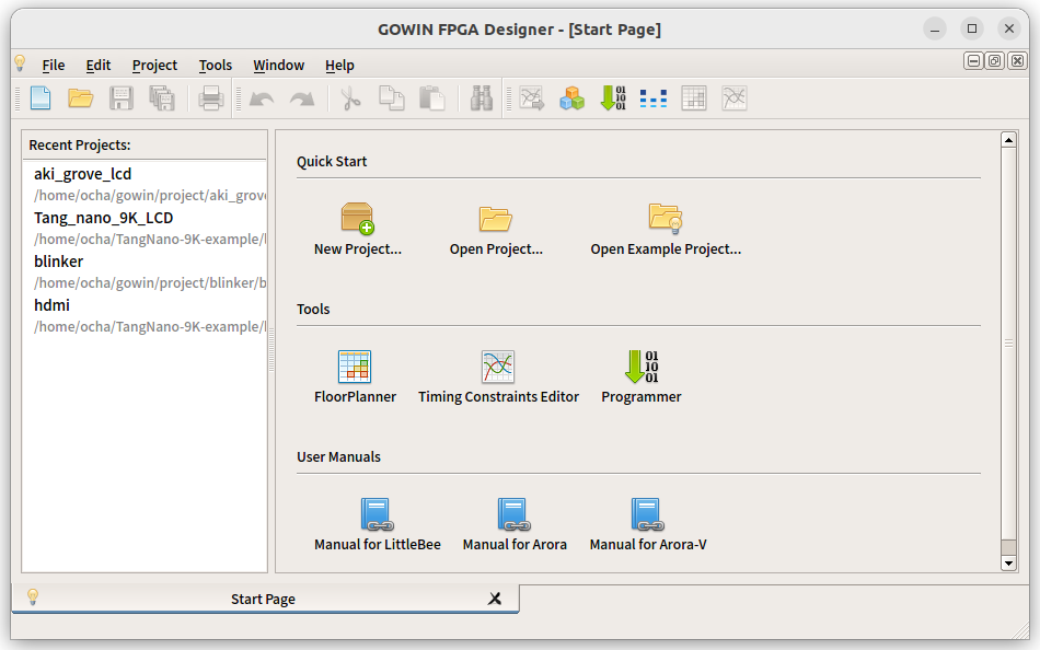 展開したディレクトリにあるIDE/bin/gw_ideを実行すればGOWIN FPGA Designerが起動します。