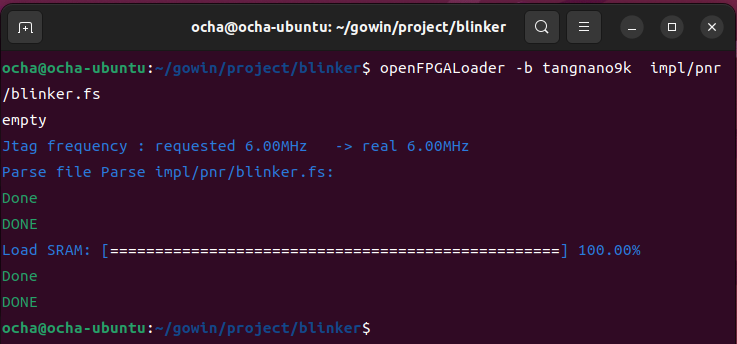 このopenFPGALoaderを使って、GOWIN EDAで生成したビットストリームを指定して書き込みを行ったところあっさり書き込めてしまいました。Tang Nano以外にも様々なFPGAをサポートしているようなので今後役立ちそうです。