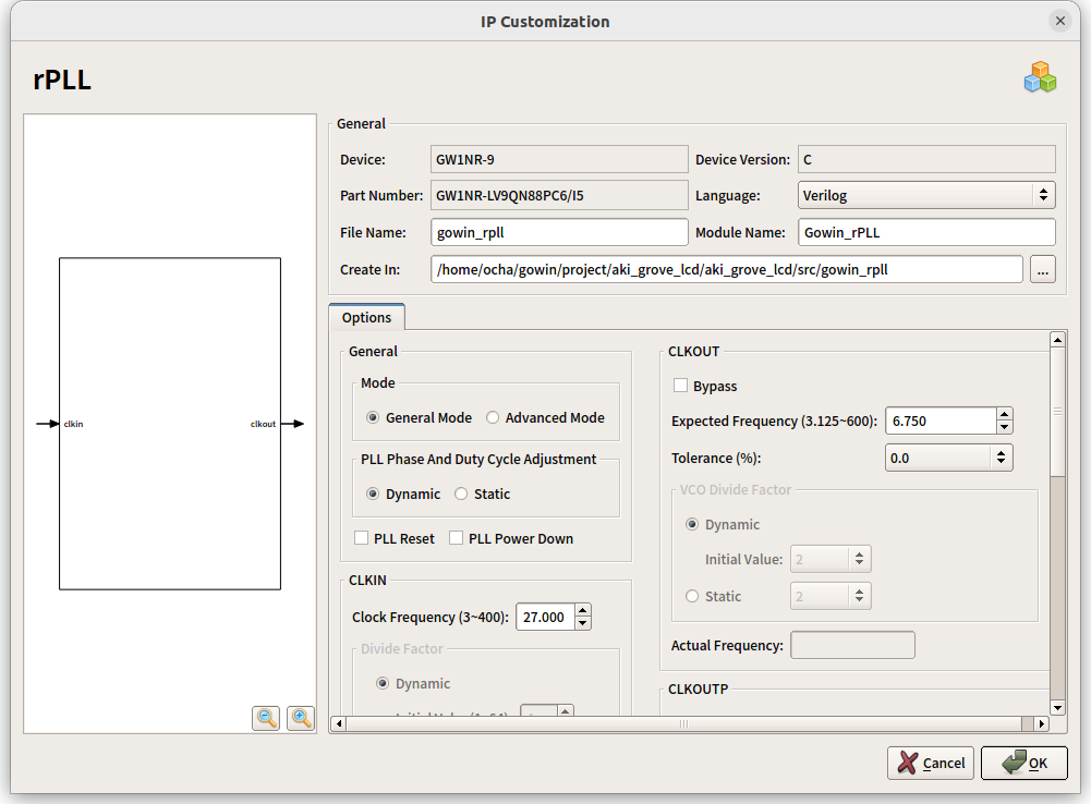 LCD表示に必要なクロックを生成するために、GOWIN EDAのメニューにあるIP Core GeneratorからCLOCK→rPLLを選択し、システムクロックの27MHzから6.75MHzを生成するようにしました。システムクロックの27MHzがどこから供給されているかは、Tang Nano 9Kの回路図で確認できます。ボード上には27MHzのXTALがあり52番ピンに供給されていました。またボード上のプッシュスイッチは3番ピン、4番ピンで1.8V系に接続されていました。これも何かと使えそうです。