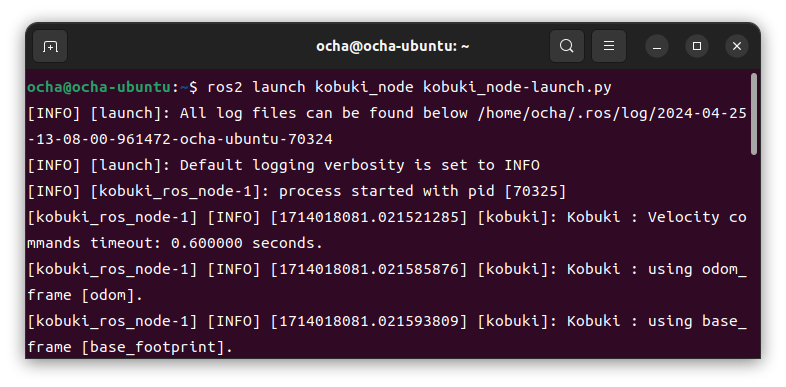 最新のファームウェアになったところで、kobukiのROS2ドライバを動かしてみます。kobuki_nodeを動かすと起動音がしたあとにたくさんのメッセージが流れましたが、特にエラーはなさそうです。