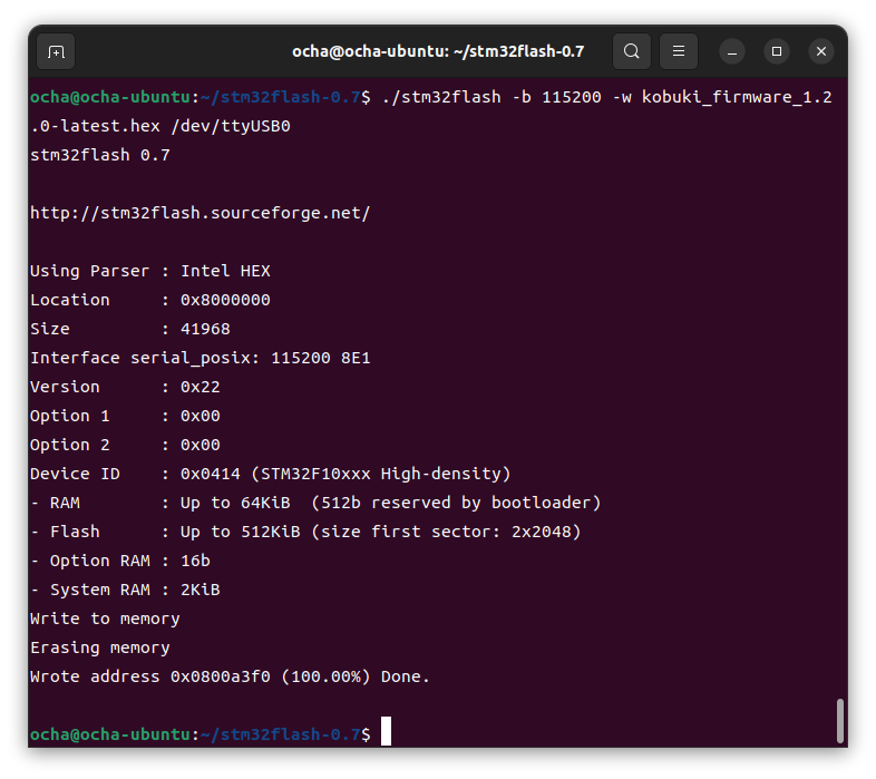 ファームウェアのアップデートはstm32flashという書き込みツールが必要のようです。ドキュメントの手順に従ってツールをコンパイルし、ダウンロードした最新のファームウェア1.2.0を書き込みました。