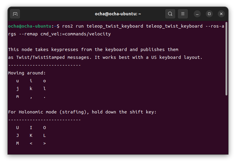 この状態で別のターミナルを立ち上げて、teleop_twist_keyboardを動かしてみます。