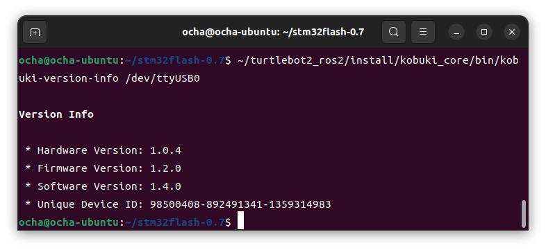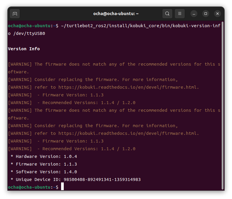 ROS2を動かす前に、kobuki_coreに含まれているkobuki-version-infoというツールを使って各種バージョン情報の確認を行いました。