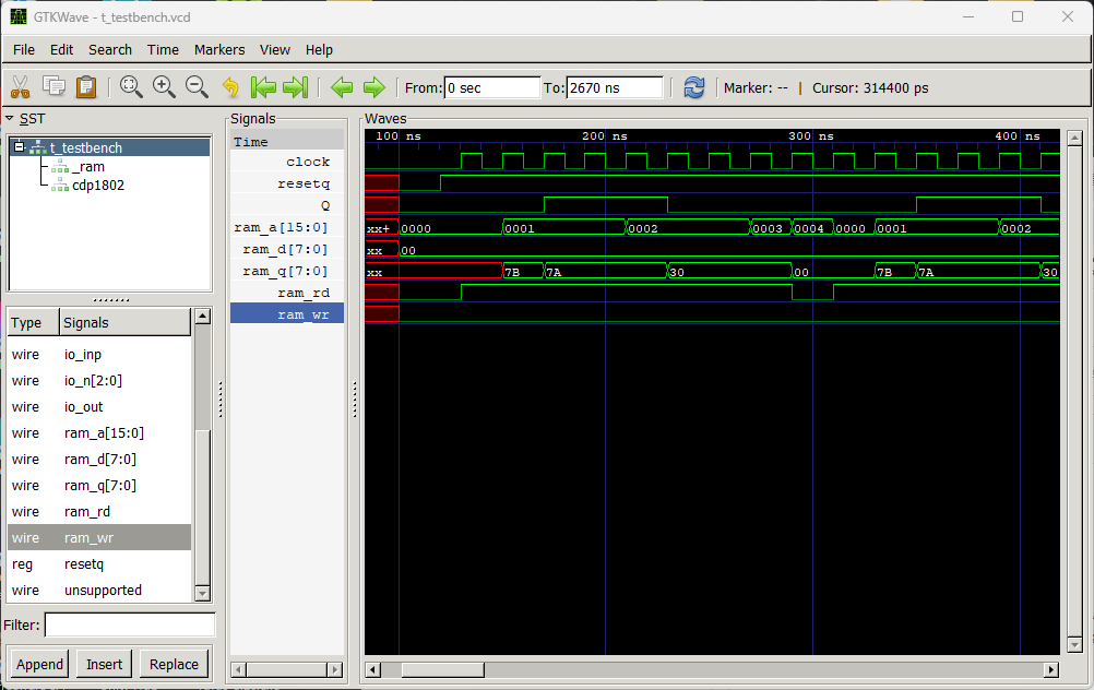 正常に実行されると別ウィンドウでGTKWaveが立ち上がり、確認したい信号を選ぶことで信号の状態が確認できます。今回は、clock, resetq, Q, ramのアドレスバスとデータバスとr/wを確認してみました。