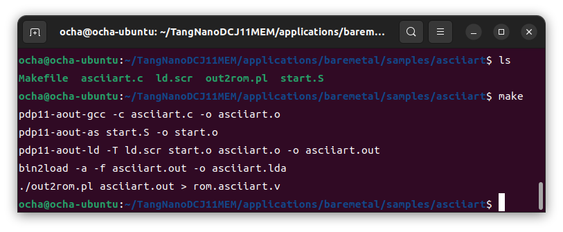 このrom.asciiart.vは、applications/baremetal/TangNanoDCJ11MEM_project.20240707/src にコピーして、rom.vにリネームします。rom.vはtop.vのソースでincludeされ、ビットストリームに組み込まれます。
