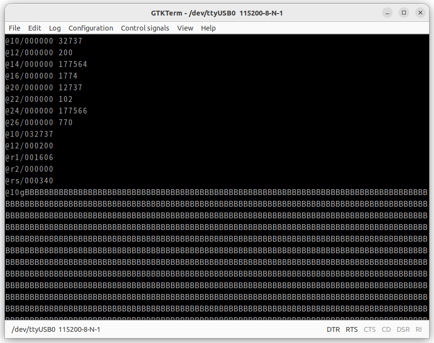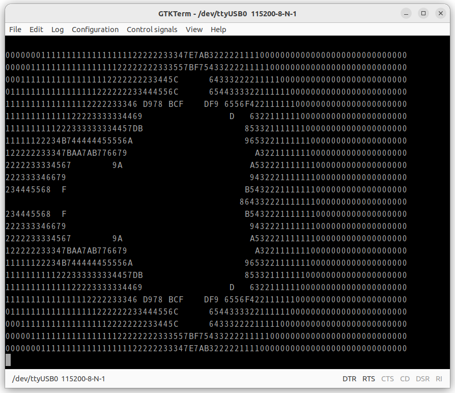 TangNano 20Kにbaremetalのビットストリームを書き込んだら、TangNanoDCJ11MEM基板のシリアル端子にUSBシリアル変換ボードを接続し、ターミナルソフトで115200bpsに設定したあとにINITスイッチを押すと以下のようなasciiartの描画が行われるはずです。