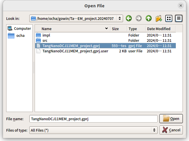GOWIN IDEの詳細な使用方法は省略しますが、TangNanoDCJ11MEMのソースをビルドしてTangNano20Kに書き込むためのビットストリームを作りたい場合は、FileメニューからOpenを選択して、GitHubからcloneしたapplication/baremetal/TangNanoDCJ11MEM_project.20240707のディレクトリにあるGOWINプロジェクトファイル TangNanoDCJ11MEM.project.gprj を指定してOpenします。