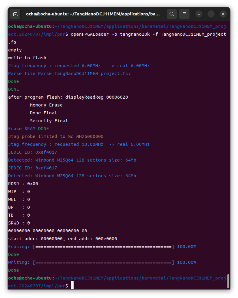ビットストリームはapplications/baremetal/pnr/TangNanoDCJ11MEM_project.fsに生成されます。ファイルサイズが大きいのですぐわかると思います。