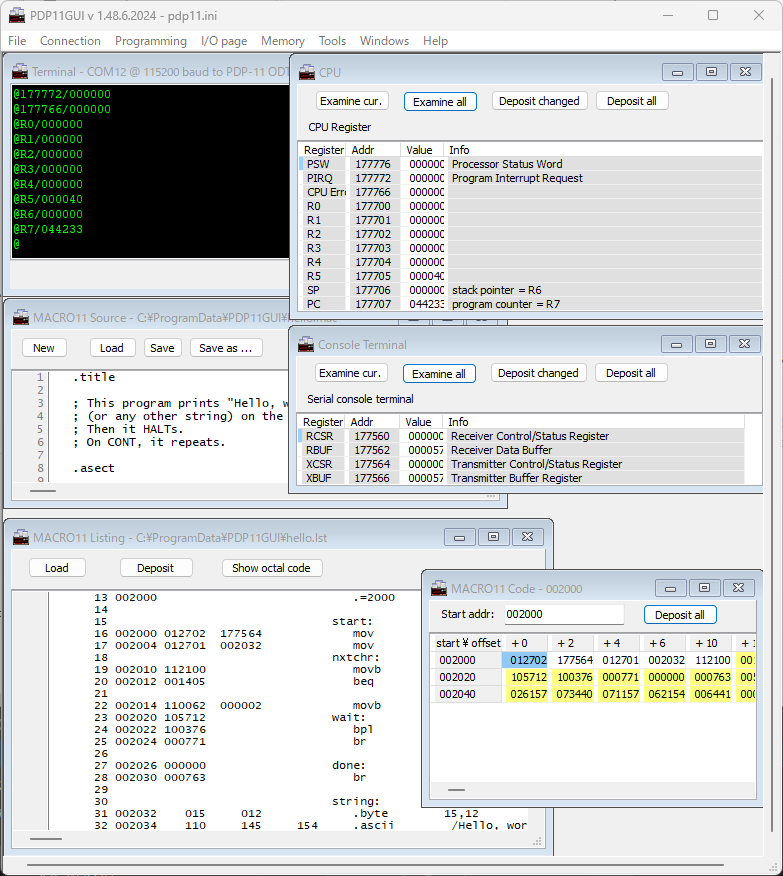 PDP11GUIではレジスタの表示やメモリ操作、メモリダンプ、MACRO11アセンブラ、逆アセンブラなど他にも強力なツールが揃っています。これを使うことでbaremetal環境で効率良く開発作業ができそうです。