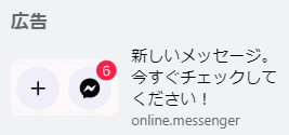 パッと見、fb.messeger(わざとスペルを間違えているかも?)と書かれていることもあり、Facebookメッセンジャーの着信数を示しているように見えますが、どうみても広告枠です。