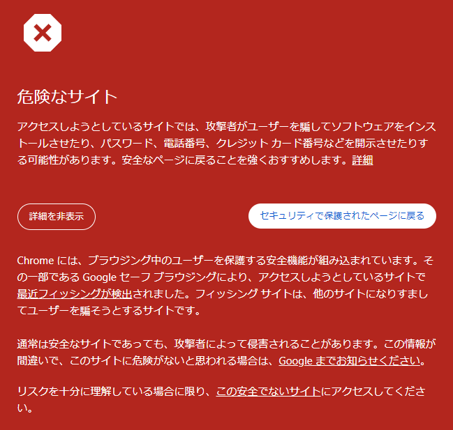 試しにその広告をクリックしてみたところ、いきなりGoogle Safe Browsingで警告画面が表示されました。