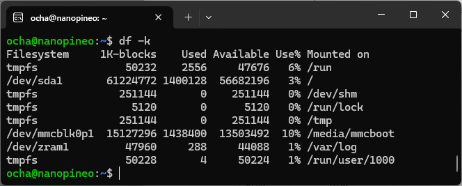 再起動後にマウント状況を確認したところ、ルートファイルシステムがSSDにマウントされていることが確認できました。