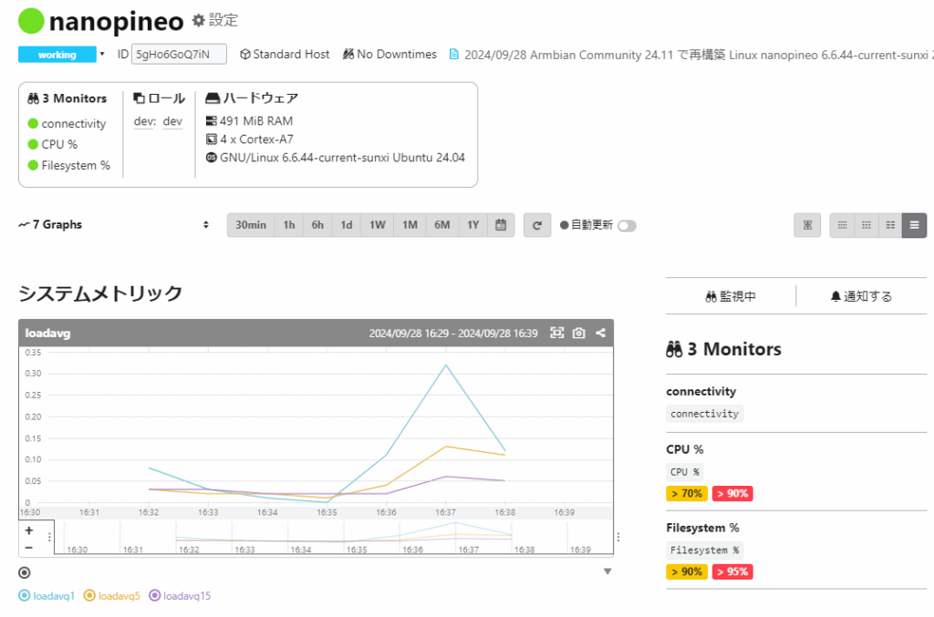 前回同様にRaspberry Pi を Mackerel で監視するの記事に従ってMackerelの監視エージェントをインストールすることでサーバ監視が再開されました。