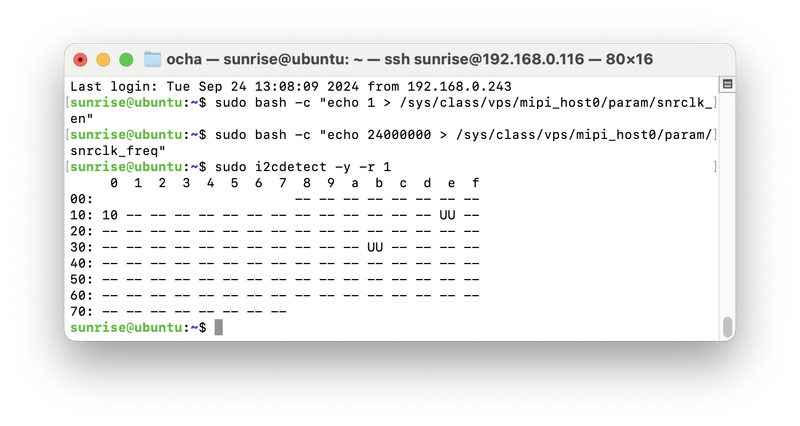 まずは実行に必要となるカメラモジュールが正常に接続できているかを確認しました。I2Cアドレス0x10として無事カメラモジュールが認識されています。