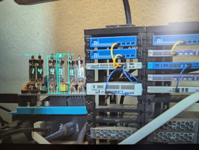 サンプルプログラムを実行したところ、机の上のVFD時計がbottleとして認識されました。他にも部屋の中のものが認識されているのですが、ここに写真を載せるのは恥ずかしいのでこの画像だけとします。Maker Faire Tokyoの会場で見たとおりのスピードが出ていると思いました。