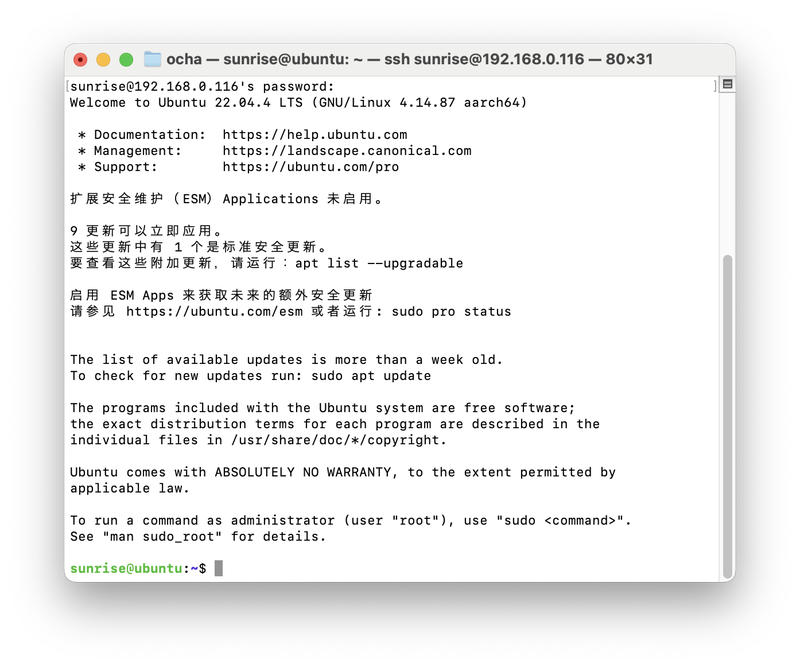 Quick Startに従ってWiFiを接続し、他のPCからsshができるところまで確認しました。OSはubuntu 22.04.4 LTSでした。