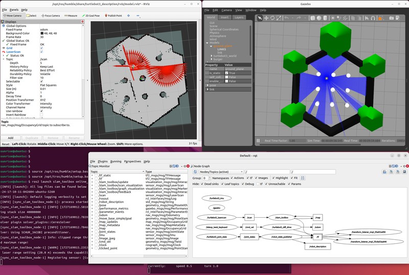 PCではGazeboによるロボットシミュレータとRviz2による可視化を行い、RDK X3でslam toolboxを動かす構成です。手順通りで問題なく動かすことができました。手順も source /opt/tros/humble/setup.bash とtros.bの環境にすることを除いて、ROS2 humbleで実行するときと同じコマンドラインです。