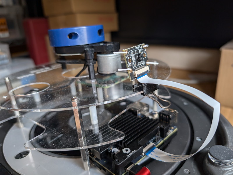 少し工夫が必要だったのはルンバへのカメラモジュールの取り付けです。ルンバにLiDARを搭載するためのフレームをダブルクリップで挟んで取り付け台をつくりカメラを針金で固定しました。これで撮影角度も自在に変えることができます。