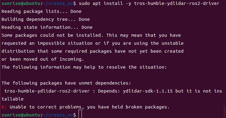 これに加えて、SLAMやNav2を行うときにはYDLIDAR X2を使用するので、NodeHubで紹介されていたYDLIDAR用のドライバパッケージをインストールしたのですが、ydlidar-sdk-1.1.15パッケージが見つからずエラーとなってしまいました。