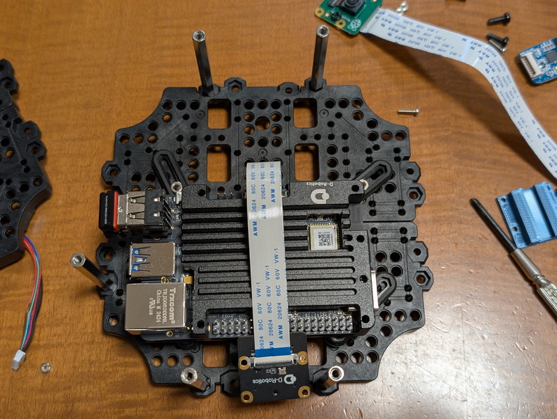 これで4本の足は自由に動きますのでTurtleBot3に固定できそうです。カメラモジュールの取り付けも考えて、次の写真のようにRDK X3を仮止めしました