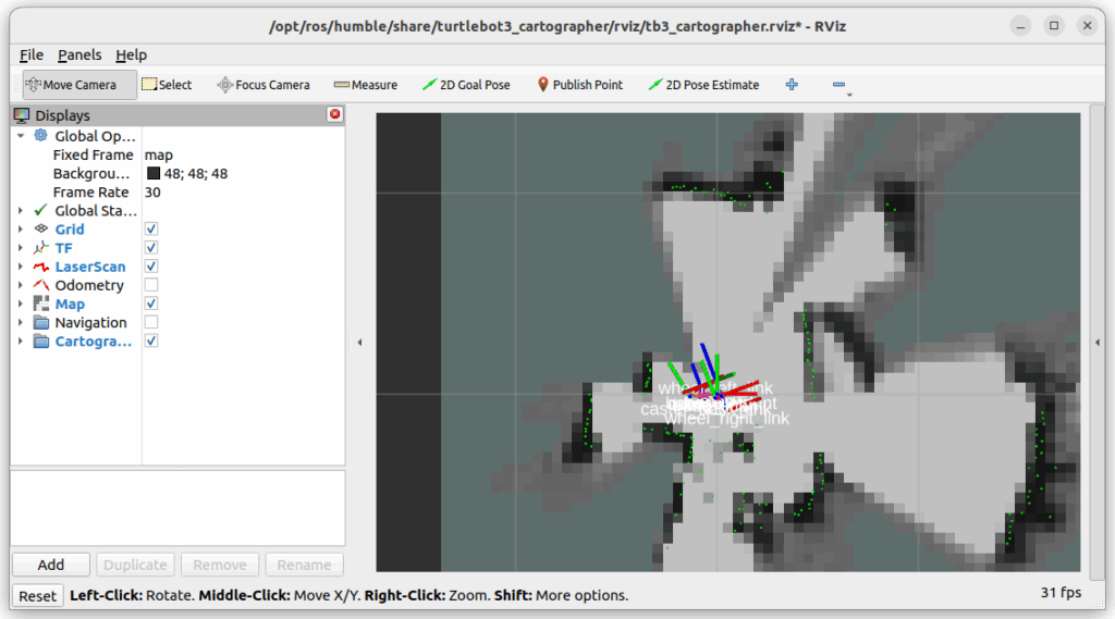 LiDARの動作を確認するために、Quick Start Guideの4.SLAM を実行してみました。画面写真にあるようにLiDARの点群も表示されて地図の生成ができています。