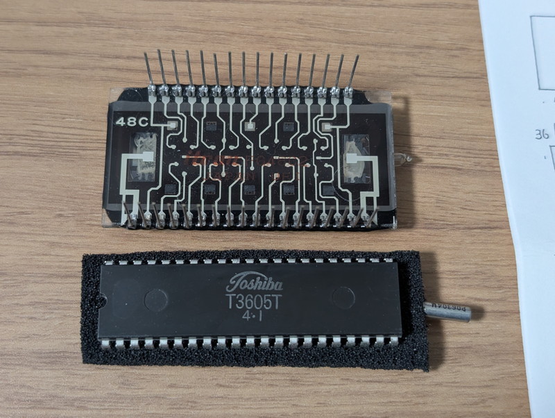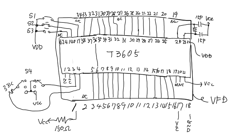 この専用IC T3605Tのデータシートを探してみましたが見つかりませんでした。添付の説明書だけが頼りです。VFDの裏面がカッコいいですね。