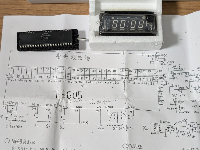 年末の大掃除をしていたときに、かなり昔にデジットさんで購入したVFD時計のパーツが出てきました。すっかり忘れておりました。パーツの内容は専用IC T3605、VFD、水晶発振子、簡単な説明書だけです。なお、現在は販売されていないようです。