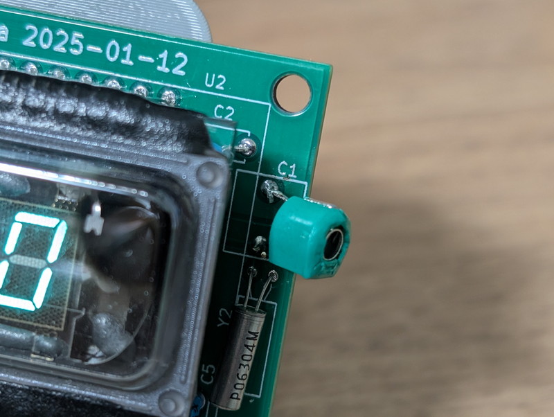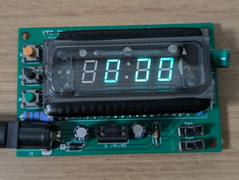 電源をいれたところ、無事VFDが点灯しました。でも、本来なら「 0:00」と表示されるのが正しいのですが1カ所点灯しません。