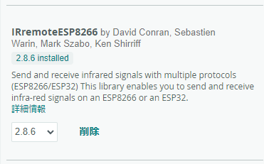 このIRユニットを制御するためにArduinoで利用できるライブラリとしてIRremoteESP8266がありますので、ライブラリマネージャーからインストールします。