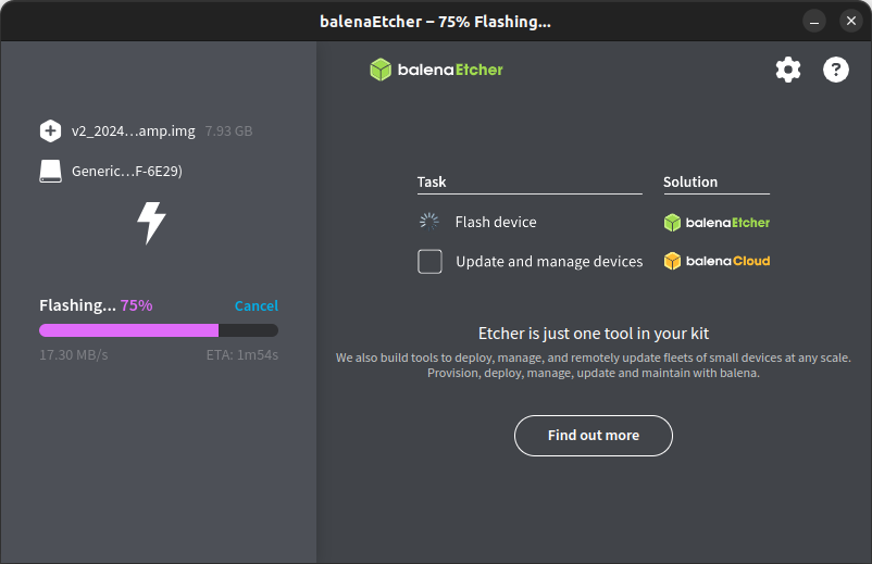 次に新しいmicroSDカードを用意してこのイメージファイルをbalenaEtherで書き込みます。書き込みかたはガイドの通りです。私の場合は32GBのmicroSDカードに書き込みました。