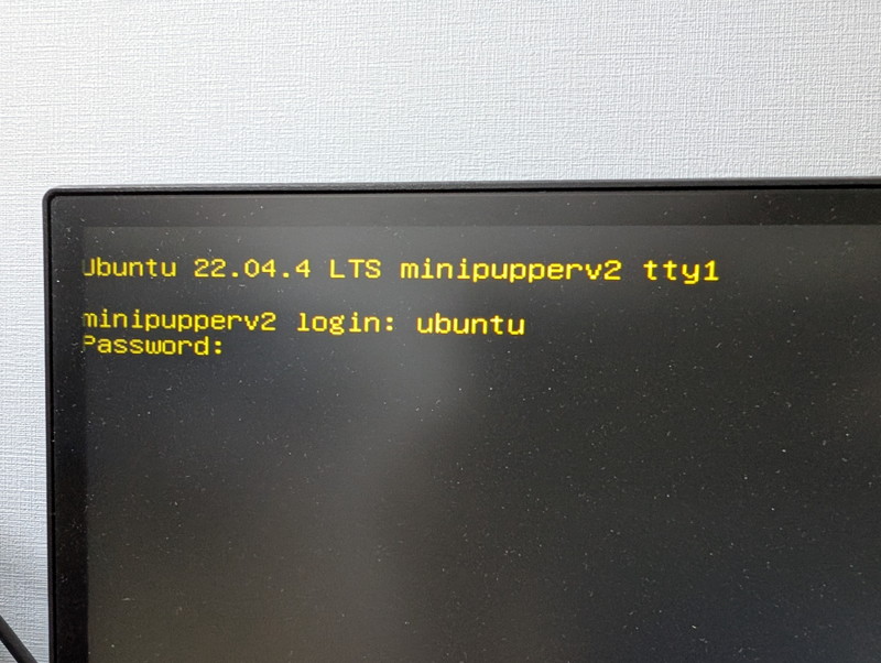 この状態で電源を投入すると、Ubuntuが起動しますのでログインして、ガイドにあるように /etc/netplan/50-cloud-init.yaml にWiFiのSSIDとキーフレーズを設定します。