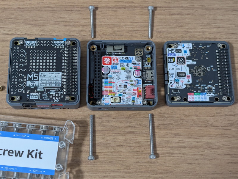 M5CoreS3にLLMモジュールを取り付けるためにはM5CoreS3とDIN BASEを固定しているネジを外す必要があります。LLMモジュールを追加するとネジの長さが当然足りなくなり固定できません。特にネジで固定しなくても問題はないのですが、少し浮いてしまうのが気になるのと、何かのはずみで外れないか心配なので別途購入したScrew Kitのネジで固定してみました。