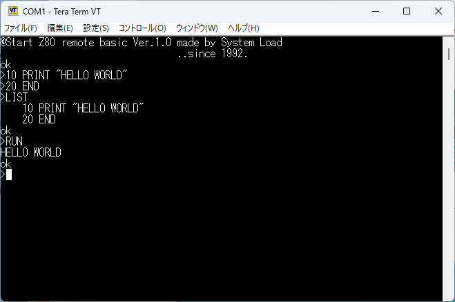 BASICインタプリタが起動しているようです。試しにプログラムを入力してみました。
