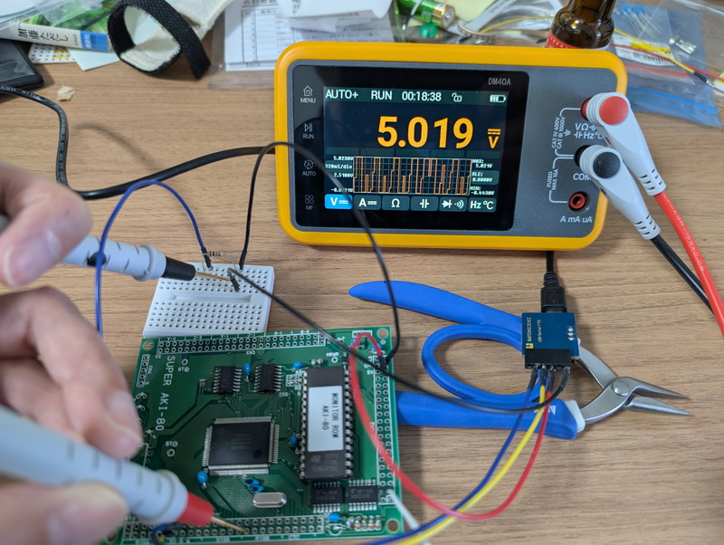 Super AKI-80にモニターROMを取り付けて、CN1 #10を10KΩでGNDに接続することで、チェック機能が動作し、1-A, 1-B, 1-C, 0-A, 0-B, 0-Cポートが1秒間隔で1,0を繰り返します。LEDを接続すればLチカになるのでしょうが、今回はDMMで1,0を確認しました。