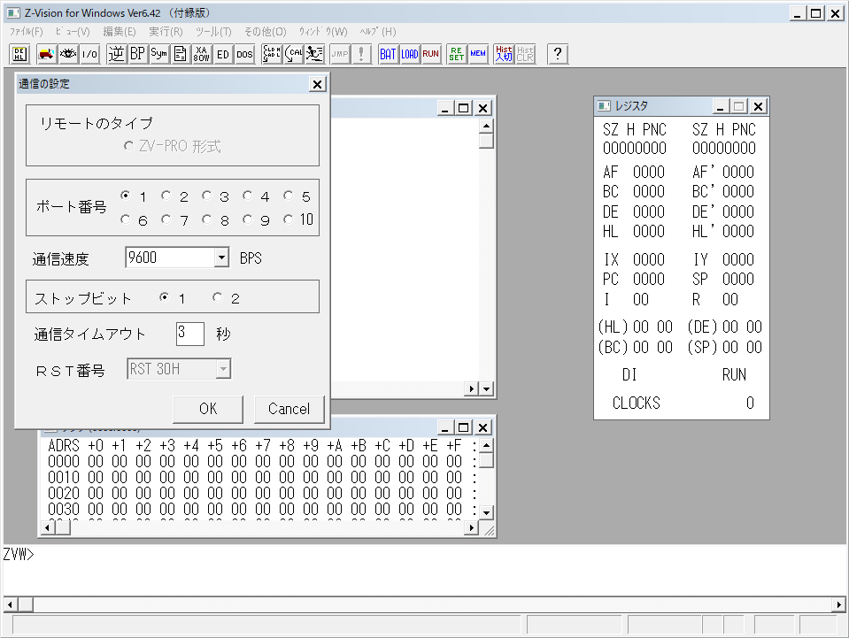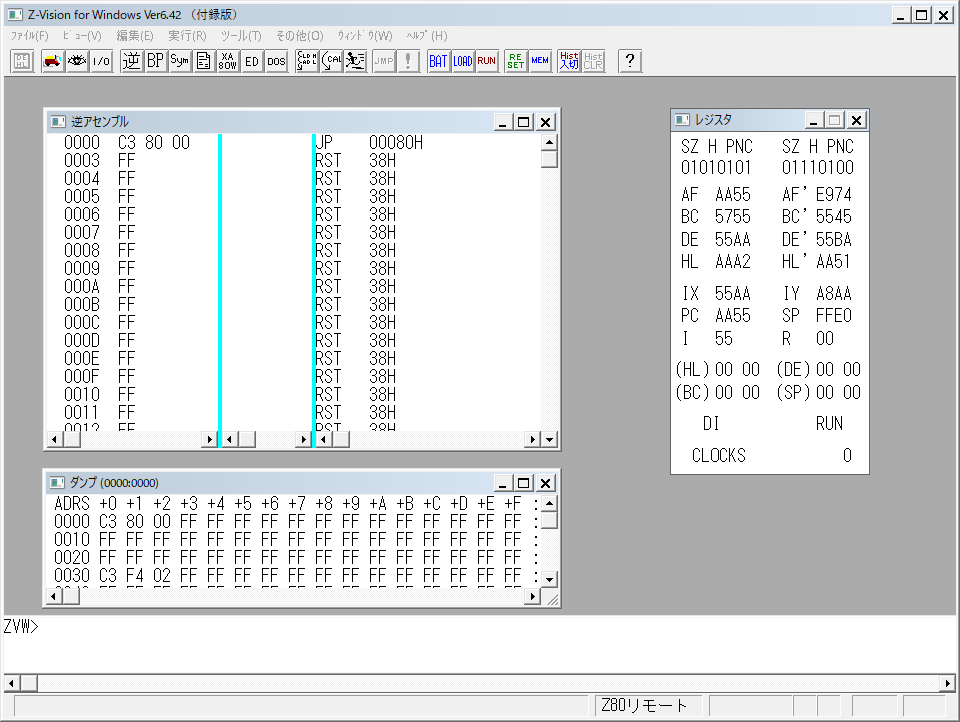 正常に接続できていればZ-Visionウィンドウの最下段に「Z-80リモート」と表示されます。