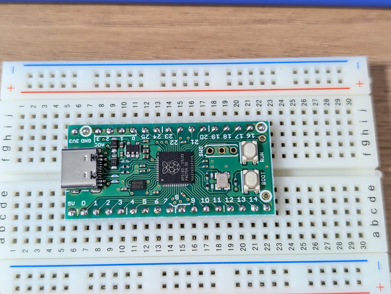 このAE-RP2040マイコンボードはRaspberry Pi Picoが使っているRP2040が搭載されていて、GPIOの全ピンが使えるようになっているものです。まずはヘッダピンをはんだ付けしブレッドボードで扱えるようにしました。