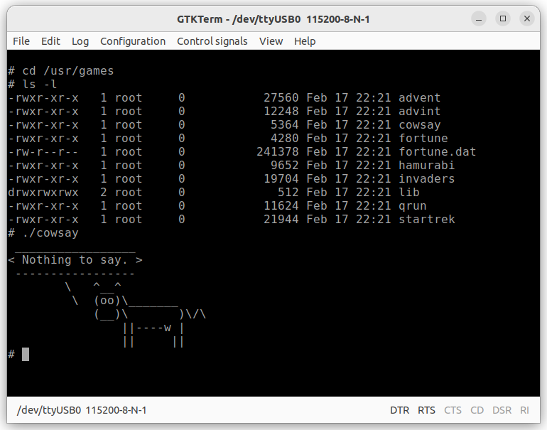 ログイン後あちこちを探検してみましたが、見た目はUnixやLinuxのような見慣れたディレクトリ構造です。/usrディレクトリを見たところ、/usr/gamesが充実していることに気が付きました。cowsayやstartrekを動かしてみましたが実際に動作しました。