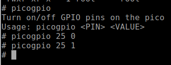 /binディレクトリを探検しているとpicogpioというコマンドを見つけました。その名の通りGPIOを制御するコマンドのようです。試しにLEDが接続されているGPIO25を0にするとLEDが消灯し、1にするとLEDが点灯しました。