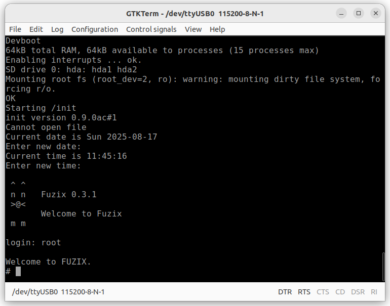 正常にFUZIXが起動するとUSBシリアルに接続したターミナルで以下のような表示になりますので、rootでログインします。