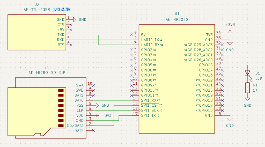 この記事はRaspberry Pi Pico用ですので、新たにAE-RP2040マイコンボードを使用した回路図を作成しました。