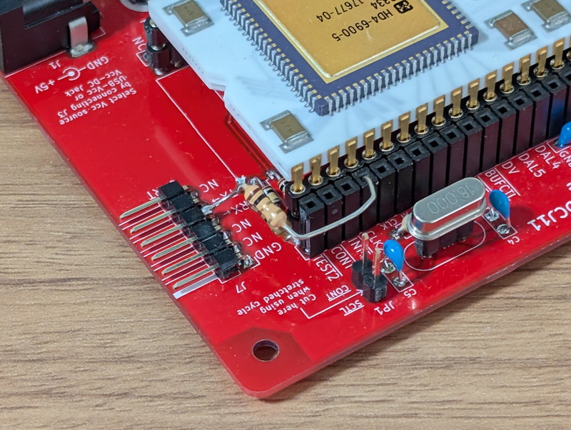 この抵抗をシリアルRXのピンヘッダの根元にはんだ付けし、空中配線でDCJ11 CPUのCLK2のピンソケットに差し込みました。