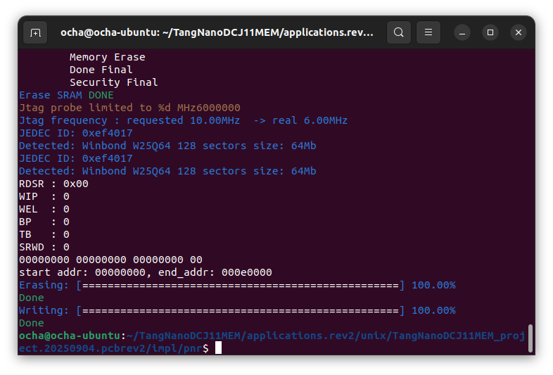 $ openFPGALoader -b tangnano20k -f TangNanoDCJ11MEM_project.fs