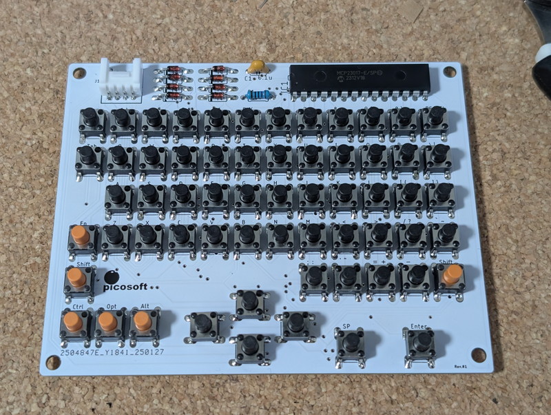Orangeputerのキーボードはタクトスイッチを62個使います。タクトスイッチはマトリクスとなっており16bit I2C I/Oエキスパンダー MCP23017に接続されています。マイコンとはI2Cで接続されます。